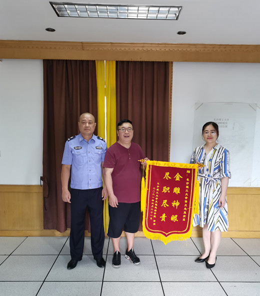 6月25日下午,学校交通运输工程学院的谢娟老师将一面写着“金雕神眼,尽职尽责”的锦旗和一封感谢信送到了保卫处金盆岭校区手里,感谢保卫处及时追踪犯罪嫌疑人,配合公安及时破案,为她找回了钱包,挽回经济损失。今年以来,保卫处利用视频监控系统,热心为师生服务,为师生找回丢失的物品30余起,寻回走失的老人、儿童2起,为公安机关提供破案线索3起。保卫处以加强校园日常安保为切入点,通过举办国家安全知识竞赛、加强防范电信网络诈骗安全宣传、开展安全隐患“大排查、大整治”等有效措施,降低了校园案件的发生,维护校园安全稳定,确保师生生命财产安全,为庆祝建党100周年营造良好稳定的校园环境。