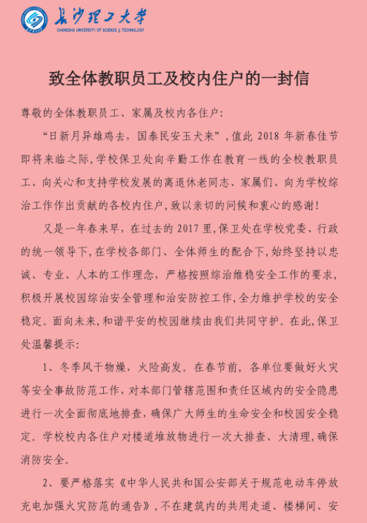 为切实做好学校寒假的安全稳定工作,保卫处已发布了《关于做好2017—2018学年度寒假安全保卫工作的通知》,要求各单位密切关注雨雪冰冻、寒潮等天气可能引发灾害的风险因素,提前做好应急准备。保卫处还向校区住户发放了《致全体教职员工及校内住户的一封信》,对他们进行安全提示,请全体住户做好冰雪防寒保暖、生活用品保障等各项应急准备工作,出门走路、开车注意安全。