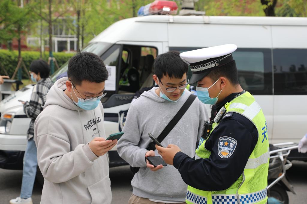 “同学,驾驶电动车一定要佩戴好头盔”、“请配合完成电动车安全教育学习并进行线上考试”,整治行动中,天心区交警大队的警官们和学校保卫处工作人员对违规驾乘的同学进行文明劝导和教育宣传,引导学生自觉遵守交通安全法规,做到规范行车、文明行车、有序停车。当天,天心区交警大队还对校园周边无牌电动车进行了现场查处。