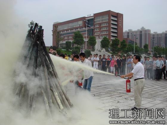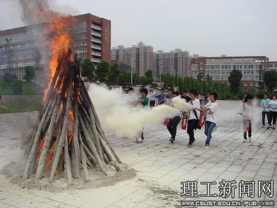 本次活动邀请了长沙市天心区公安消防大队领导和省消防协会专业人员进行了应急疏散、逃生知识讲座。讲座结束后,开展了应急疏散、逃生演练,并燃放了烟雾弹。面对滚滚浓烟,学生们情绪稳定、模拟逃生逼真,有的用毛巾、衣袖捂住口鼻、头戴防毒面具,迅速、有序、安全地撤离出现场。随后保卫人员现场讲解、示范灭火器材的使用方法,并组织学生开展了现场灭火演练,在熊熊大火面前,文先明副校长和同学们一起参与了灭火实地操作体验。