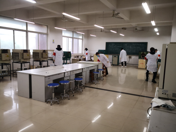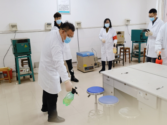 在实验中心主任贺浩的带领下,党员志愿者们穿戴工作服并佩戴好了一次性橡胶手套,针对不同的实验教学场所,严格按照实验室消杀相关工作要求,对实验教室﹑实验设备﹑实验模具、实验台面等高频接触面和重点部位进行了全面的喷洒消毒,做到不留死角、全面消杀。