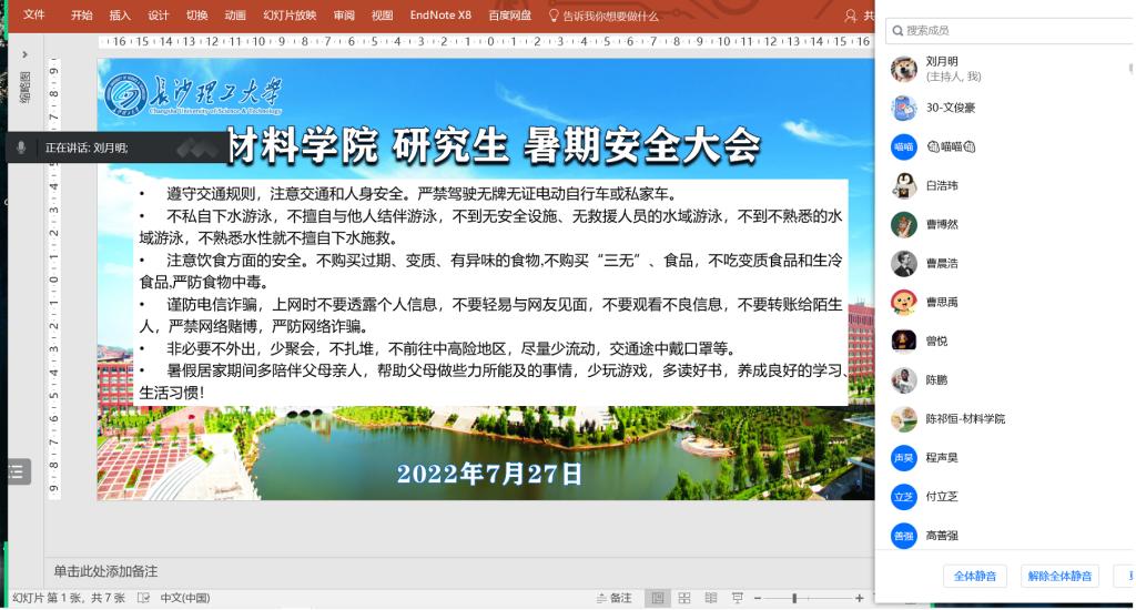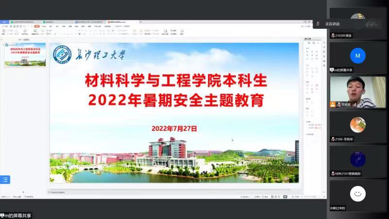 为进一步强化暑期学生安全防范意识,材料学院于7月26日-27日分年级分批次开展安全教育线上会议,全体辅导员出席会议,全体学生参加。