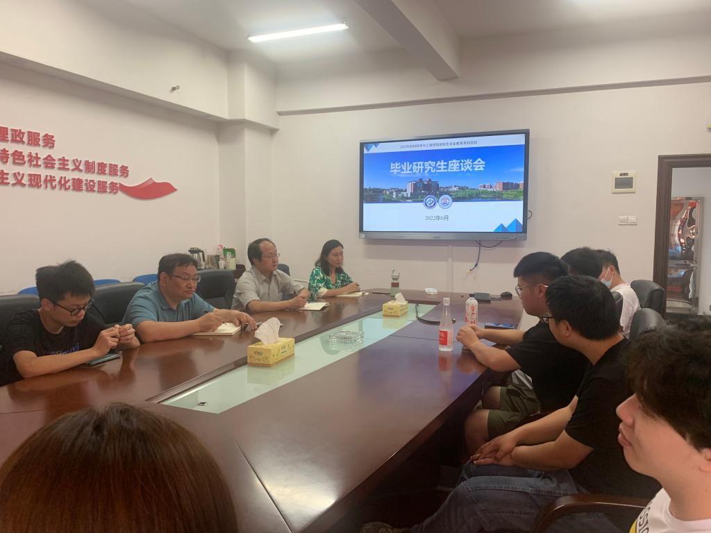 6月9日上午,材料学院于新能源大楼1栋313开展毕业研究生座谈会,材料学院党总支书记唐超文、分管研究生副院长杨现锋出席会议,党总支副书记陈华主持,毕业研究生代表楼雪纯等13人参加。