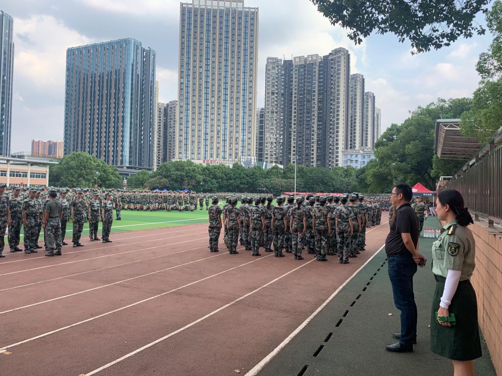 9月16日下午,材料科学与工程学院党总支书记张国强、党总支副书记陈华来到金盆岭校区田径场深入新生军训场地,亲切慰问2021级全体新生和承担军训任务的教官。