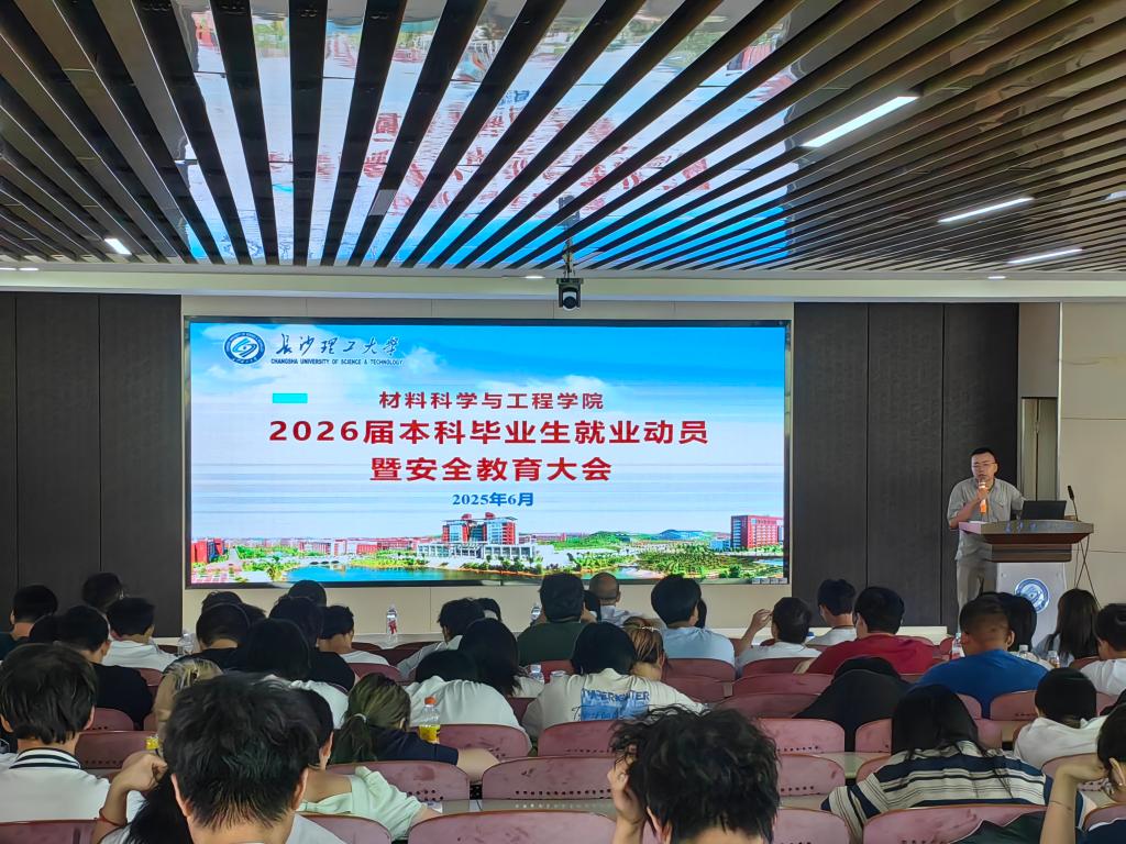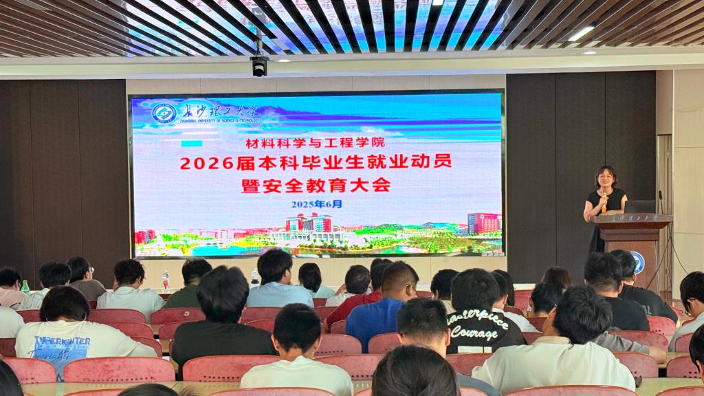 2025630日下午,材料科学与工程学院在工科三号楼A307报告厅召开2026届本科毕业生就业动员暨安全教育大会。学院党委副书记邵巧艳、副院长谢炜教授、学工办主任兼就业专干谢易真出席,会议由年级辅导员谭方林主持,全体2026届本科毕业生参会。