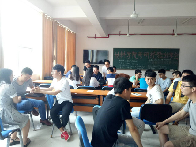 5月22日至5月31日期间,材料学院在新能源大楼1号楼成长辅导室举行了考研经验分享会,2017届考研学霸们纷纷传授经验,40余名大三学生到场进行交流。