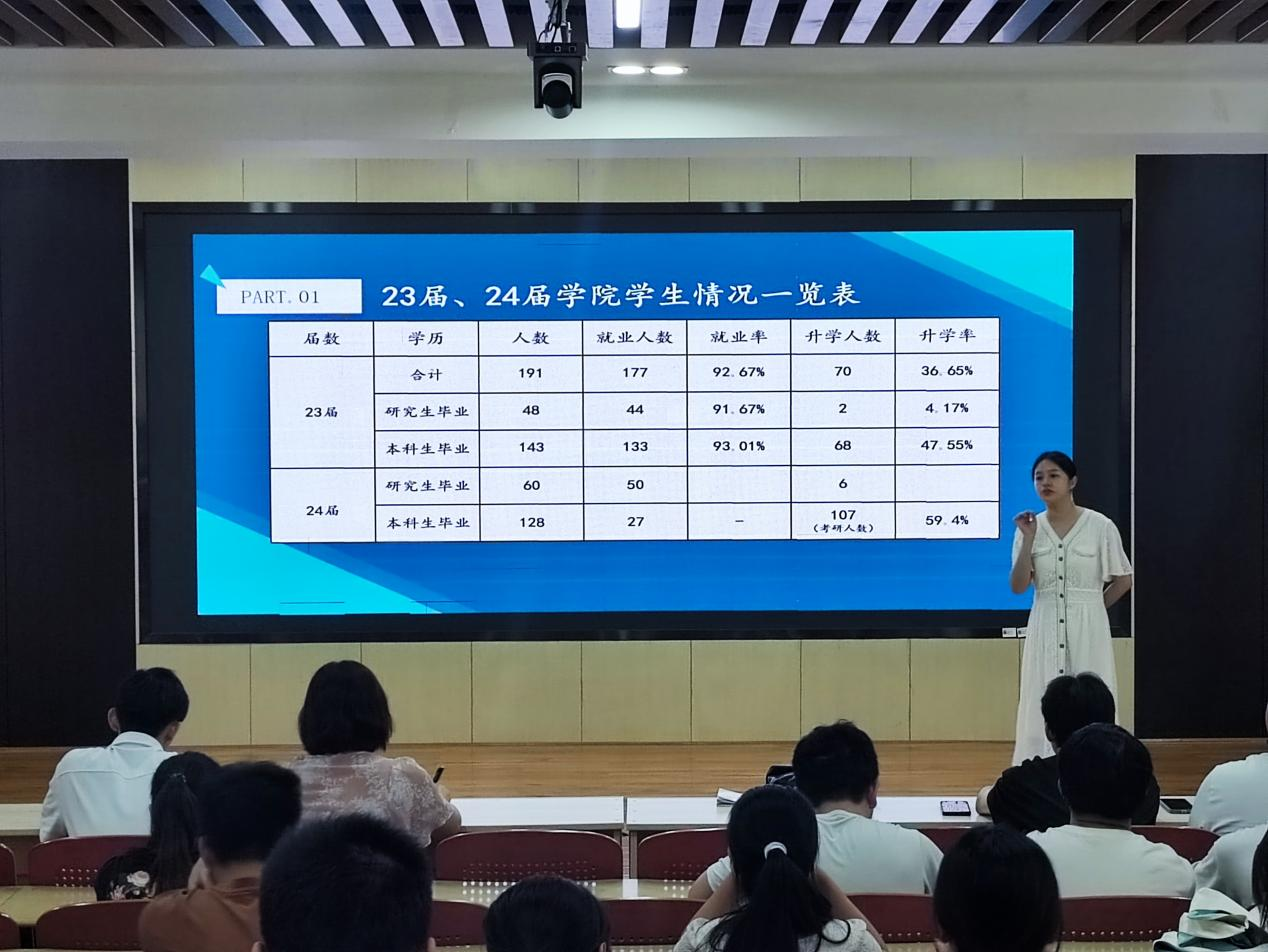 谢易真首先就学院23届、24届学生就业和升学情况向同学们进行了讲解和数据分析。她强调,考研要慎重选择目标和方向,就业要保持积极乐观的心态和行耕不辍的勇气。谢易真结合学院近八年毕业生的就业去向给同学们分析了今年的就业形势,并重点推荐了公司以帮助同学们更好地把握就业机会。