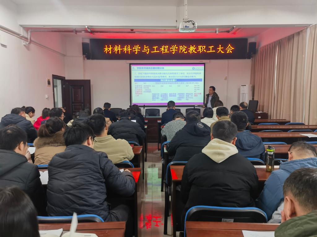 2025年1月18日下午,我院召开教职工大会,会议主要讨论《材料学院教师岗位绩效分配办法》。会议由李灵均副院长主持,全体教职工参加。