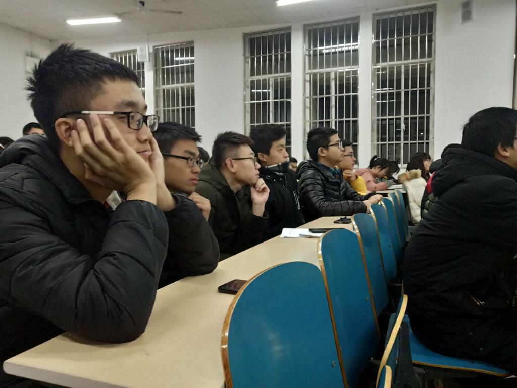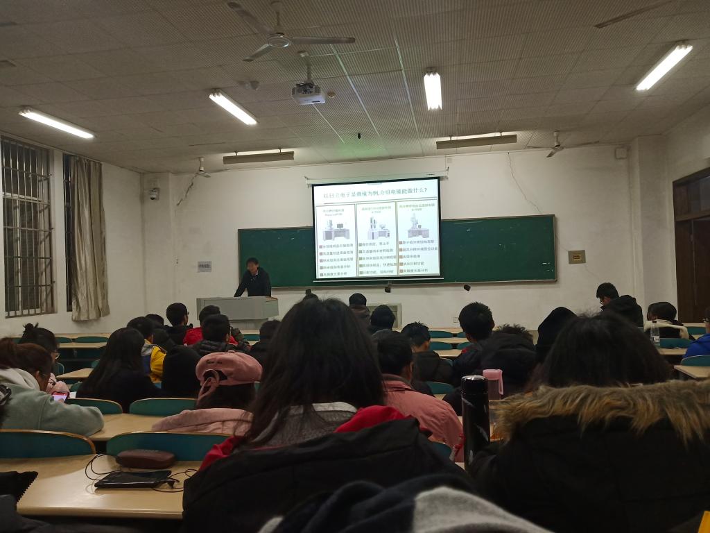 同学们早早地进场并做了准备。18点30分范教授准时开始了今天的讲座范教授首先介绍了电子显微镜的作用和在材料领域的必要性和重要性。并根据几种不同的电镜分别介绍了它们的作用,首先范教授和同学们介绍的是扫描电镜,范教授讲这种电镜可以将材料放大到几十万倍甚至上百万倍而普通的光学显微镜最大也只能放大到2000倍左右。接下来的透射电镜则更为神奇,范教授告诉同学们这种电镜可以让我们感受到材料的内部结构,据此判断出材料的某些性能以及解释材料反应时出现现象的原因。范教授反复强调:“电镜是分析各种材料结构的基础,没有电镜材料的研究将无法进行下去。”范教授鼓励同学们去了解电镜了解更多的有关材料的事物。范教授结合自己的亲身经历告诉同学们在大学要养成好的习惯:能够去多交流——无论是和同学、和学长学姐还是和老师都要敢于去交流。无论完成什么事情靠自己一个人的力量终究是不够的。大学生协作的能力一定要拥有;敢于多提问——在大学,只要你提出问题,老师一定会尽可能的帮你解答,每个人心中都会有疑惑一定要勇敢地提出来;保持心理健康——同学们要有开放的心态,性格开朗。这样无论遇到什么风吹雨打都可以克服困难。