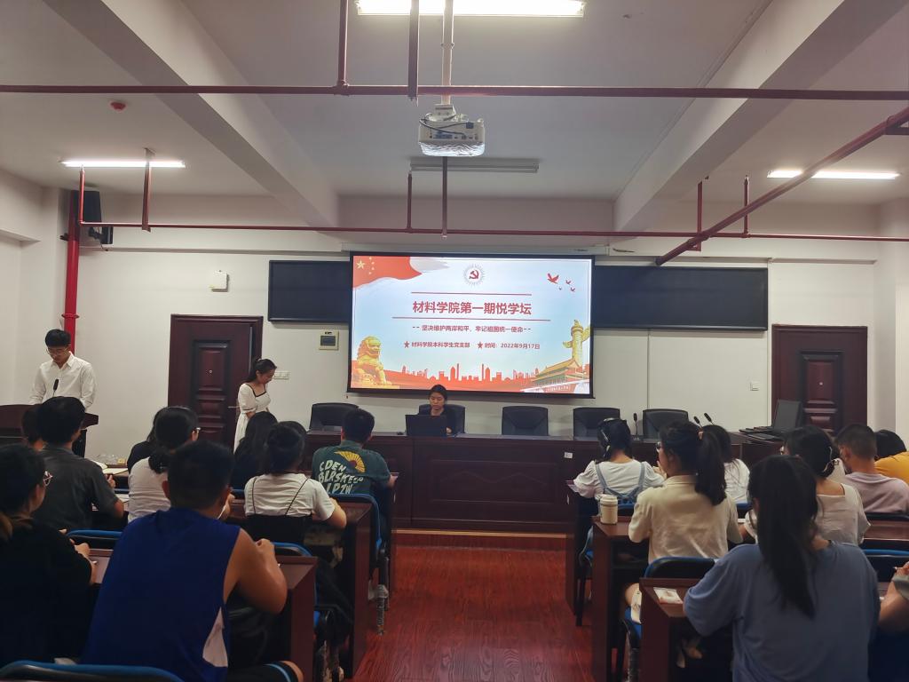 9月17日晚7时,材料科学与工程学院本科学生党支部于新能源一号楼302室举办第十三期悦学坛常态化学习活动,本次悦学坛主题为“坚决维护两岸和平,牢记祖国统一使命”。本次悦学坛由学生党员王巍锝主持,共36名积极分子参加。