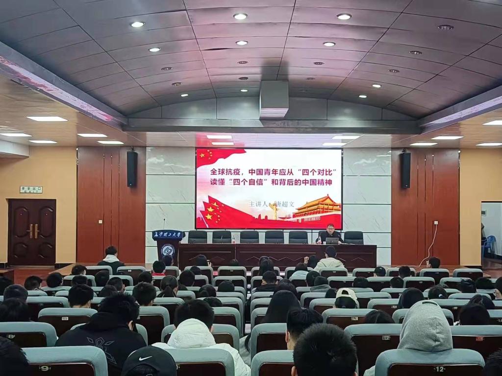 唐超文以全球抗疫,中国青年应从“四个对比”读懂“四个自信”和战役背后的中国精神为主题,讲述通过人民为中心的发展理念、党领导一切的政治原则、问题倒逼改革的创新品质对比方向抉择来理解道路自信;通过总体安全观、开放发展理念、人类命运共同体理念对比执政方略来理解理论自信;通过政治制度优势、组织体制优势、民主机制优势对比治理模式来理解制度自信;通过坚守中华文化立场、不忘本来,面向未来,吸收外来文化对比精神塑造进而理解文化自信;并向同学们剖析了战役背后的中国精神,其包括:履职尽责,冲锋在前的奉献精神、众志成城,同舟共济的团结精神、自强不息,越挫越勇的奋斗精神、构建人类命运共同体担当精神。最后,唐超文强调要学会结合抗击疫情背后的中国精神从“四个对比”读懂“四个自信”,坚定理想信念。