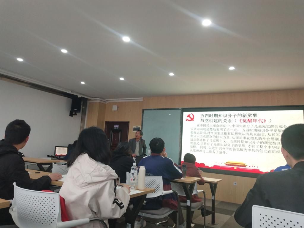 4月27日下午,材料学院分党校第二十三期预备党员专题党课在新能源一号楼402展开,马克思主义学院教授赖某深和能动学院党委副书记靳攀科主讲,全体预备党员学员参加。
