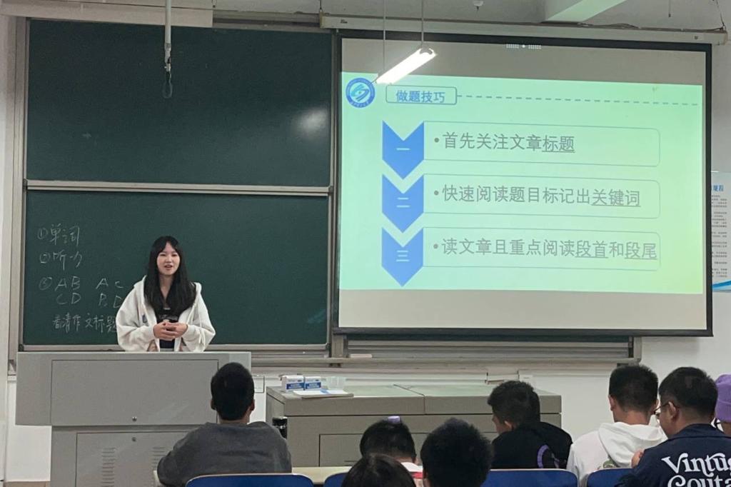 为加强学风建设,发挥朋辈帮扶在学业指导中的积极作用,材料学院开展“真材实料”朋辈团体辅导,从高年级中选拔思想积极向上、英语成绩优异、具有良好的沟通交流能力的优秀朋辈互助员担任小讲师,为在大学生英语四级备考中遇到困难的同学提供一定帮助和指导,讲解答题技巧。
