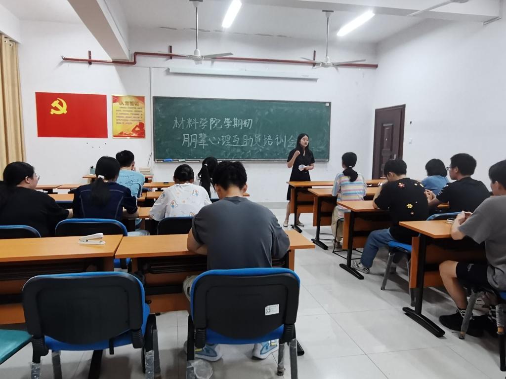 9月15日晚19点,材料学院在新能源一号楼303室召开学期初朋辈心理互助员培训会。学院心理辅导员谢易真主讲,各年级级朋辈心理互助员参加。