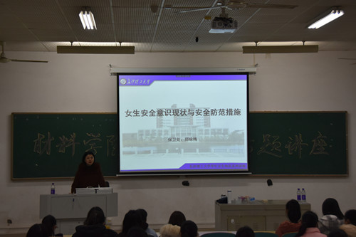 3月7日,材料学院于综合教学楼A105举办女生安全专题讲座,本次讲座由保卫处副处长郑咏梅主讲,院党总支副书记唐青、辅导员陈鑫林、谢易真出席,材料学院研究生、本科生女生参加。