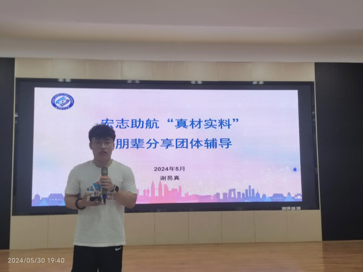 2024年5月30日晚,材料学院第二十八期宏志助航“真材实料”朋辈分享团体辅导在工科三号楼A201展开,辅导员谢易真、2020级学生代表主讲,2021级全体学生参加。