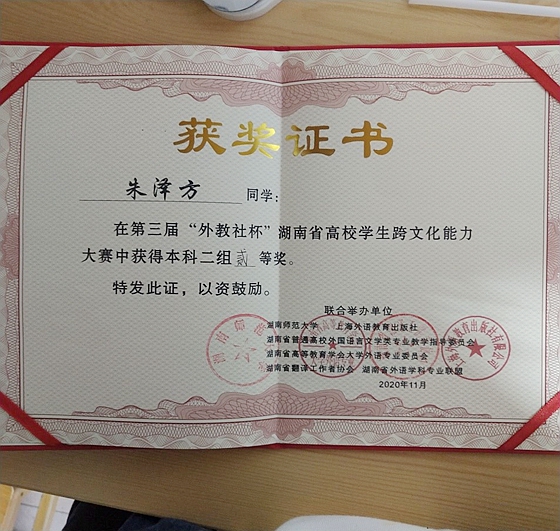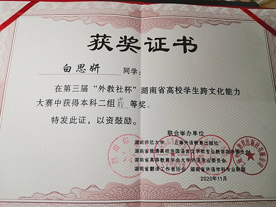 11月22日,第三届湖南省高校学生跨文化能力大赛在湖南师范大学落幕,来自全省43所高校的选手参赛角逐。城南学院法学1901班白思妍、英语1901班朱泽方和法学1802班张勋组成的XK星空城南学院代表队,经过学校初赛选拔、省复赛及决赛的激烈角逐,从案例展示与分析、文化知识问答、视频情境评述和讲述中国文化故事等方面,用跨文化视角展现他们的所思所想,创新形式广受好评,最终获得本科二组二等奖。