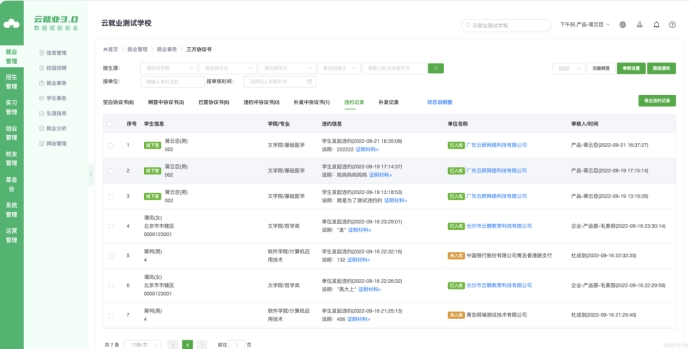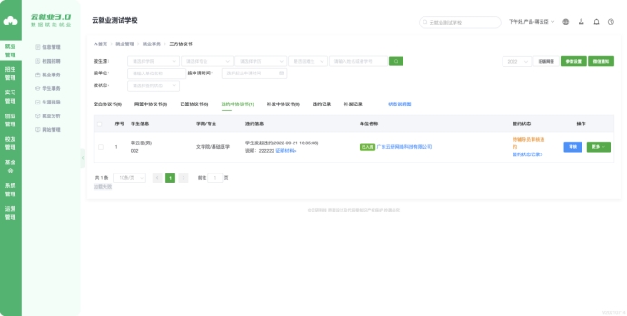 当单位或学生发起违约时,老师可以在【违约中协议书】进行审核。审核通过后,协议书自动回到【空白协议书】,学生可发起新签;