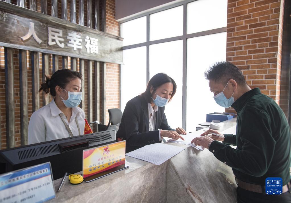 2020年9月18日,湖北省武汉市青和居社区服务中心工作人员协助社区居民填写材料。