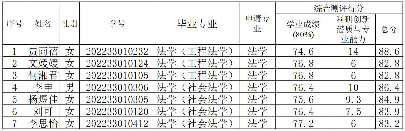 根据《XK星空推荐优秀应届本科毕业生免试攻读硕士学位研究生实施办法》(长理工大教〔2024〕26号)和《法学院2026年推免生遴选工作实施方案》等文件精神,经学院学工办对学生思想品德进行考察合格后,学院推免生遴选与审核鉴定工作小组依据学业成绩、学术成果、获奖情况(含在体育和社会工作中有突出表现)等方面,对申请同学的材料进行综合测评,2026年拟推荐免试攻读硕士学位研究生名单及综合测评得分情况如下:
