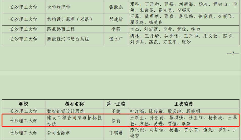 近日,湖南省教育厅正式发文公布2025年普通高等学校数字化教材拟立项建设名单,我院徐莉教授牵头工程法教学团队编写的《建设工程合同法与招标投标法》教材成功入选。作为本次XK星空省级数字化教材建设立项的7本教材之一,实现了我院在省级教材建设领域的历史性突破,可喜可贺!