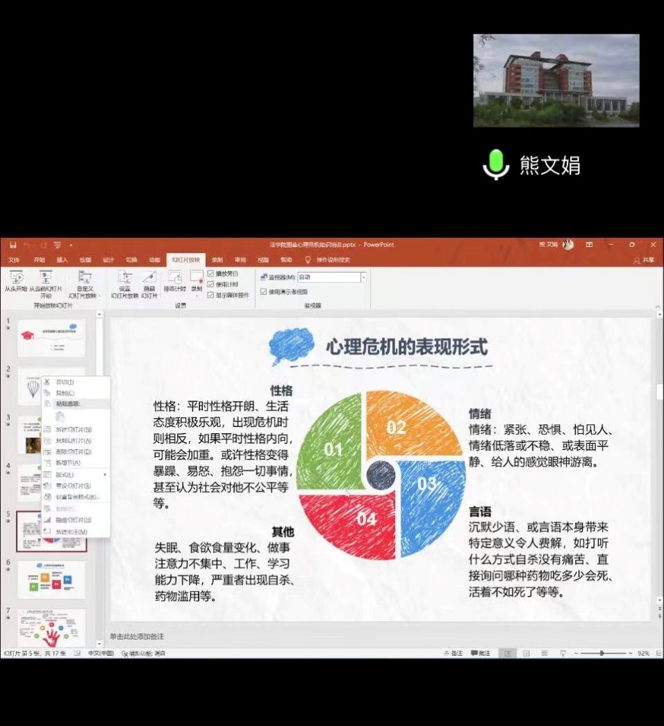 培训以心理危机的定义、表现形式、危险征兆、解决方式为主要讲解内容,内容充实,具有很强的实用性,通过以生活中的事例进行举例,使知识生动化形象化,更容易使朋辈互助员所理解。熊老师结合对法学院展开的心理育人问卷调查结果,强调了疫情之下同学们心理变化的客观性,鼓励同学们认真的对待心理危机,并提出了应对心理危机的众多建议。本次培训活动结束后,将由参与会议的朋辈互助员对广大同学进行知识分享,进行自由交流。