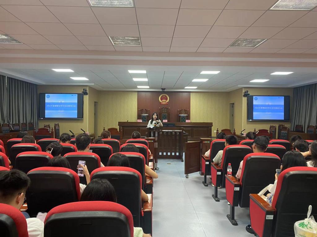 为加强暑期留校学生安全意识和自我保护意识,保障学生安全健康,法学院于6月29日晚19:00在金盆岭四教模拟法庭开展暑期留校学生安全教育大会。
