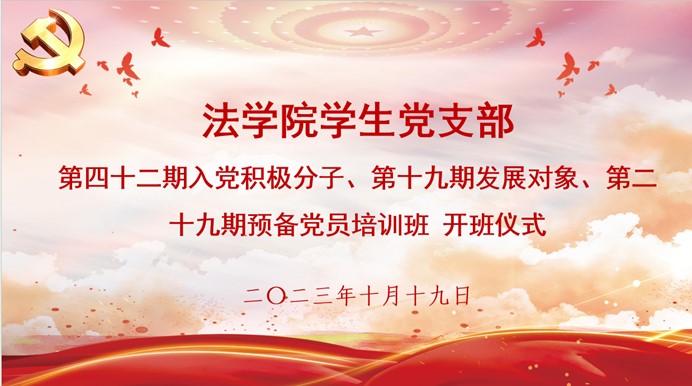 按照学校党校要求,经过法学院党总支决定,10月19日晚,法学院第42期入党积极分子培训班、第19期发展对象培训班、第29期预备党员培训班举行开班仪式。学院党总支副书记汪功伟、党建辅导员孙佳乐出席仪式。会议由学生党建工作中心成员王佳奇同志主持。