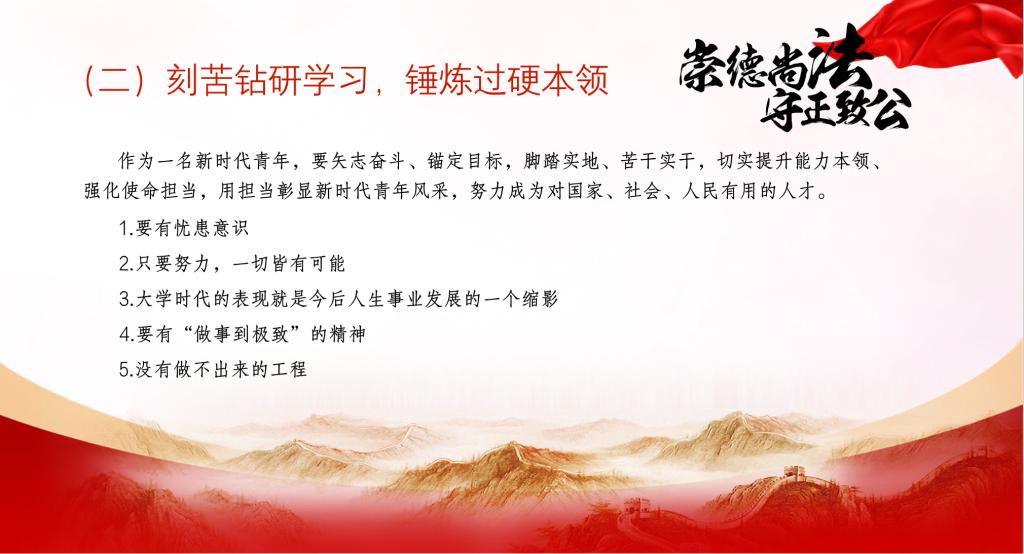 然后,龚文斌结合自身的学习和工作经历,指出:作为新时代的青年学子,要坚定理想信念,牢记初心使命,把现实思考与专业理论紧密结合,在全面依法治国,推进法治中国建设的征程上勇挑重担、冲锋在前;要刻苦钻研学习,锤炼过硬本领,增强忧患意识、危机意识和自律意识,珍惜大学美好时光,保持超越自我追求卓越的进取精神不断提升专业水平和综合素质;要树立标杆榜样,发挥模范作用,在学习和生活中,立标杆、树形象、做表率,坚定不移听党话,矢志不渝跟党走。