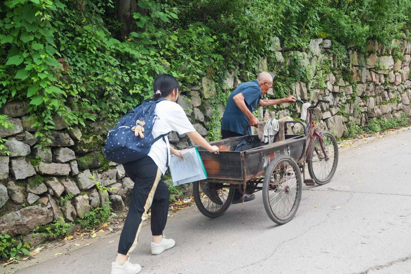 下午时分,在瑞塔铺镇罗家边社区,彭金花主任带着实践团成员挨家挨户走访,一路上遇见了背着背筐的张大伯、赶集回来的杨阿姨……烈日炎炎,成员们主动上前,为偶然遇见的爷爷分担重负,合力推动起他那满载的推车,如同清凉的微风拂过心田,爷爷的心中涌起难以言喻的温暖与感激。在同爷爷告别后,团队成员们接着向碰到的沈奶奶询问地里的玉米收成情况,与她就相关情况展开攀谈,并发放了宣传海报。所有人都没想到的是,奶奶用手指着一字一句将海报读了出来:“共同守护我们的蓝天净土”,这一幕深深印入团队成员们的脑海,令人动容。