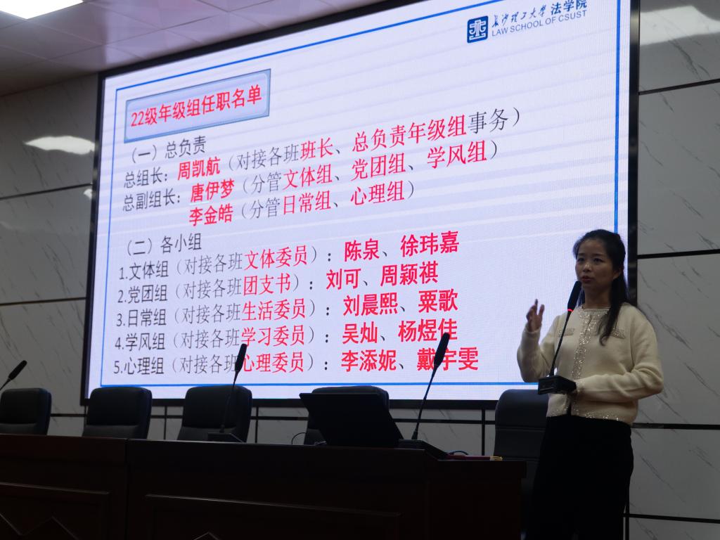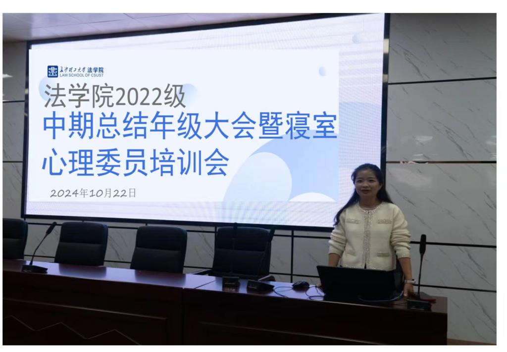 10月22日16点,法学院在四教报告厅召开2022级本科生中期总结年级大会暨寝室心理委员培训会。此次大会由2022级辅导员孙佳乐老师主持、2022级全体本科生参加。会议围绕校园安全教育、学风考风督察、优秀学生表彰、年级组任职公示、寝室心理委员培训等五项内容开展。