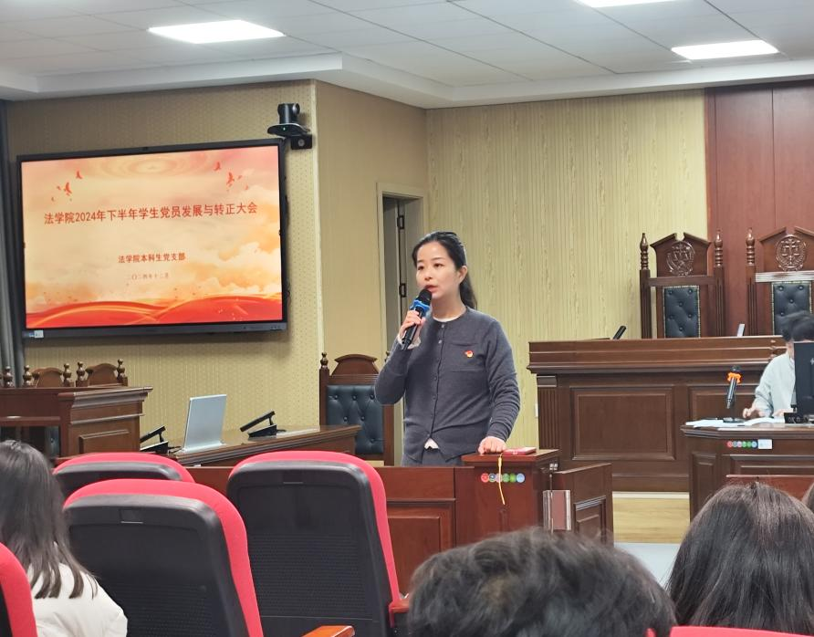 近日,法学院本科生党支部在四教模拟法庭召开党员发展与转正大会,本次大会主要讨论刘可、李雪等4名发展对象的入党问题及王紫玉、丁媛媛等11名同志按期转为中共正式党员的问题。法学院本科生党支部书记孙佳乐老师及本科生党支部全体党员同志参加本次会议。