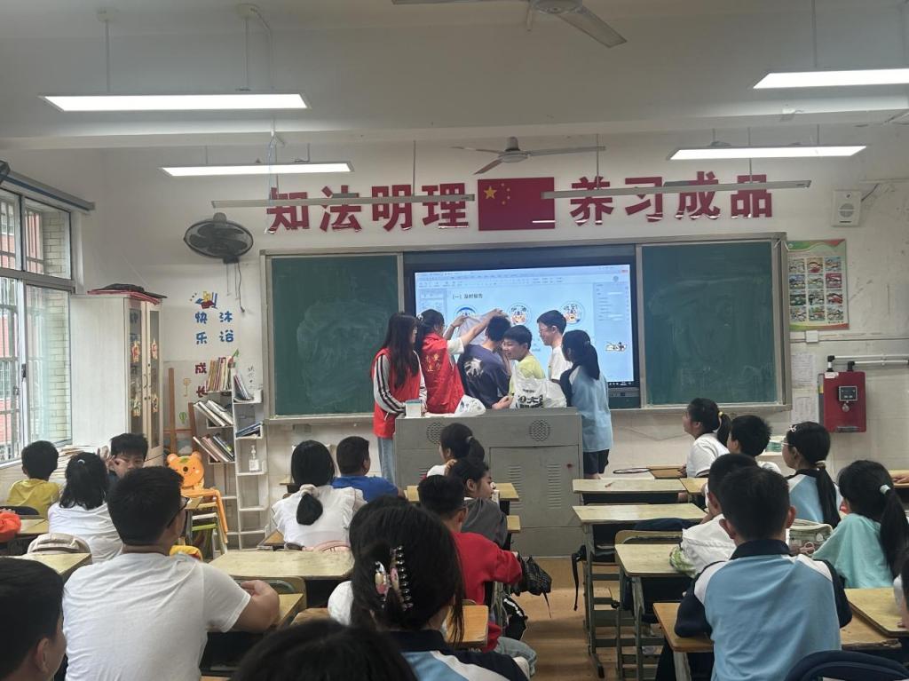 “《民法典》第一千一百八十八条规定,无民事行为能力人造成他人损害的,由监护人承担侵权责任;《未成年人保护法》第三十九条明确禁止学生欺凌行为……”普法团成员以真实案例为切入点,将晦涩的法律条文转化为生动的“法治故事”。通过展示三块印有法律条文的自制“盾牌”,带领学生齐声诵读,并借助“白衬衫隐喻实验”,引导孩子用黑笔标注霸凌行为、红笔勾画心理伤痕,直观呈现校园霸凌的隐性伤害。“法律不仅是惩罚,更是修复与保护的力量。”志愿者结合《治安管理处罚法》《预防未成年人犯罪法》等,系统阐释了霸凌行为的法律边界与维权路径,让“纸面上的法”化作守护童心的“盾牌”,以专业赋能,让法律条文转化为“听得懂的生命课”。