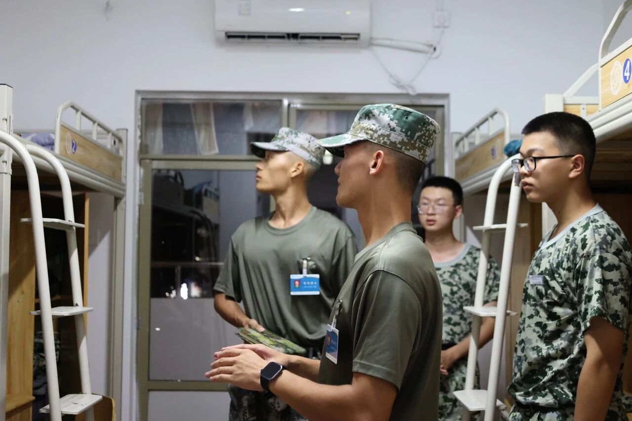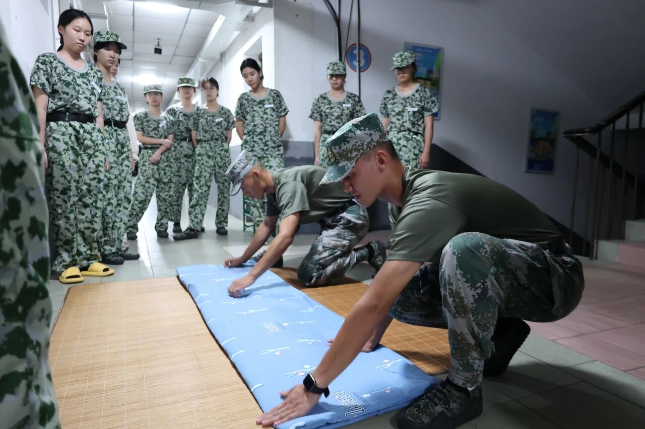 训练归来,走进新生寝室,教官们褪去了训练场上的严肃,化身细致的“生活导师”,手把手教学叠被子的技巧。从抚平被子到捏出棱角,讲解如何将被子叠得方方正正。同时,教官们还细致叮嘱大家,要保持寝室环境的干净卫生,不仅要打造整洁的居住空间,更要在日常点滴中培养自律严谨的生活习惯,让新生们在细节处感受到军训带来的成长与蜕变。