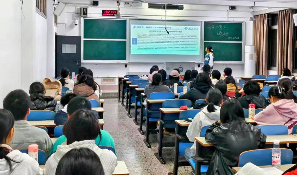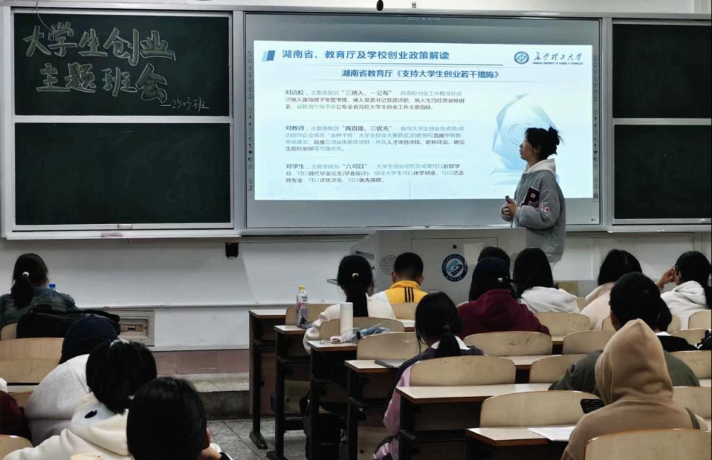在各班班主任、班委的主持下,各班班会有序进行。各班创新创业委员结合精心准备的PPT,围绕湖南省及学校出台的一系列支持大学生创新创业政策措施进行了系统讲解,帮助同学们了解政策红利,培养创新意识,提升创新创业能力。