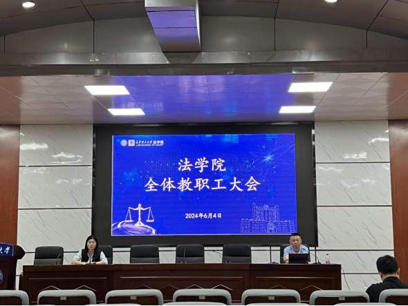 6月4日下午,法学院在金盆岭校区四号教学楼1楼学术报告厅召开本学期第五次全体教职工大会,会议由院党委书记龚文斌主持,全院教职工参加会议。