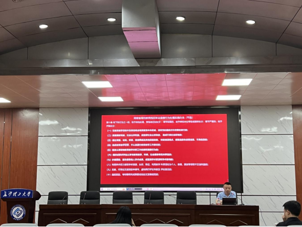 会议首先进行师德师风专题教育。为进一步树牢“师德师风是评价教师队伍素质的第一标准”的理念,切实提升全体教师思想政治素质和师德水平,龚文斌带领大家原原本本学习了《湖南省高校教师违反职业道德行为处理实施办法》等相关文件,结合实际案例,深入阐述了加强师德师风教育的必要性紧迫性,要求大家严守底线、不越红线,为人师表、以身作则,争做有理想信念、有道德情操、有扎实学识、有仁爱之心的“四有”好教师。