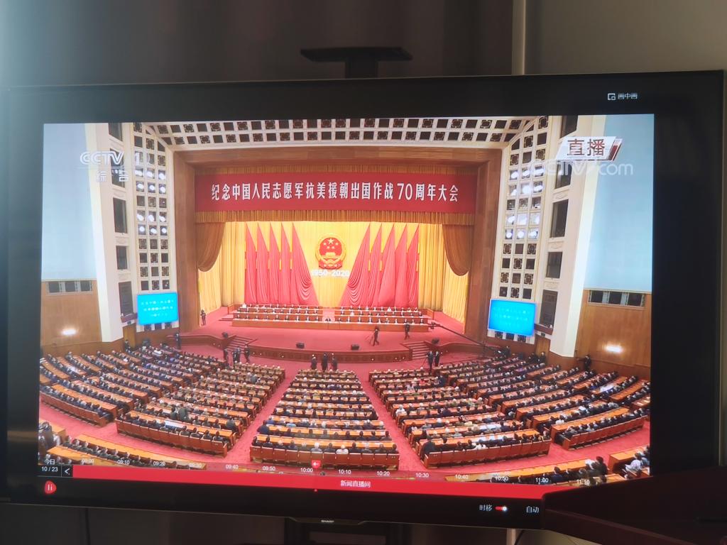 10月23日上午10点,法学系组织在家的行政管理人员和部分学生代表观看纪念中国人民志愿军抗美援朝出国作战70周年大会直播,共同缅怀在抗美援朝这场伟大战役中为国捐躯的民族英雄,铭记伟大胜利,弘扬伟大精神,推进伟大事业。