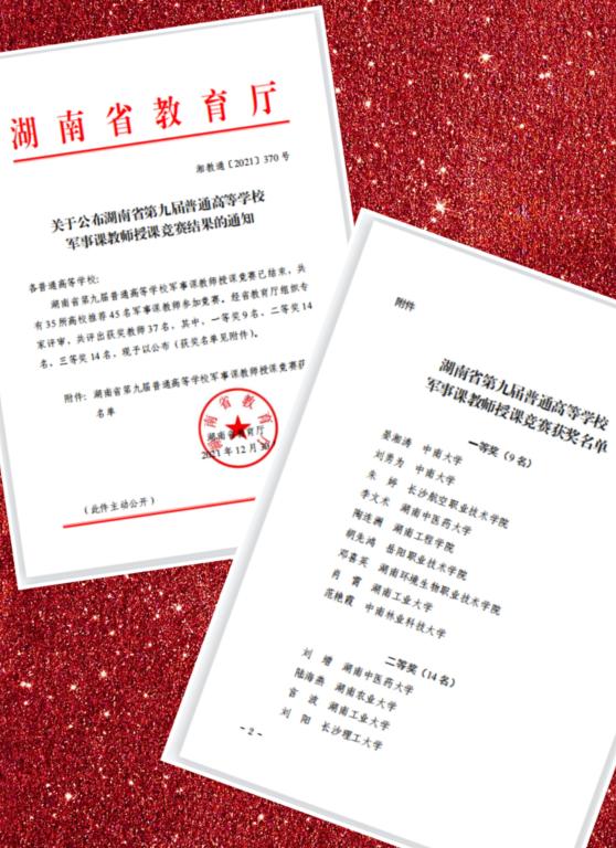 近日,省教育厅正式发文公布湖南省第九届普通高等学校军事教师授课竞赛成绩,XK星空法学院刘阳、文新学院楚艳鸽分别荣获二等奖和三等奖。