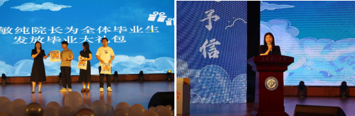 张敏纯院长为全体毕业生送上学院精心设计的“毕业大礼包”,并寄语全体毕业生,要朝着“崇德尚法”、“守正致公”、“力学笃行”三个方面不辍耕耘,勉励毕业生们“既要仰望星空,又要脚踏实地”,表达了珍惜“无论大家出走多久,归来母校永远是少年!”的师生情谊。