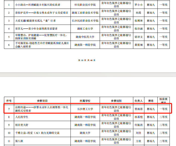 8月3日-8月4日,备受瞩目的2024年湖南省大学生创新大赛在湖南第一师范学院圆满闭幕。我院学子组成的“法稚归途——涉罪未成年人社调帮教一体化新模式引领者”团队(负责人:贾雨蓓,成员:王家、王佳奇、罗佳怡、王佳怡、贺锦鸿、陈雨欣、钟利伟、许玉玲、杨煜佳、杨爽、周凯航、梁静旖;指导老师:刘文莉、汪伦、徐莉)凭借创新的思路和扎实的实践,在激烈的竞争中脱颖而出,赢得了评委的高度认可,获得青年红色筑梦之旅公益组一等奖。
