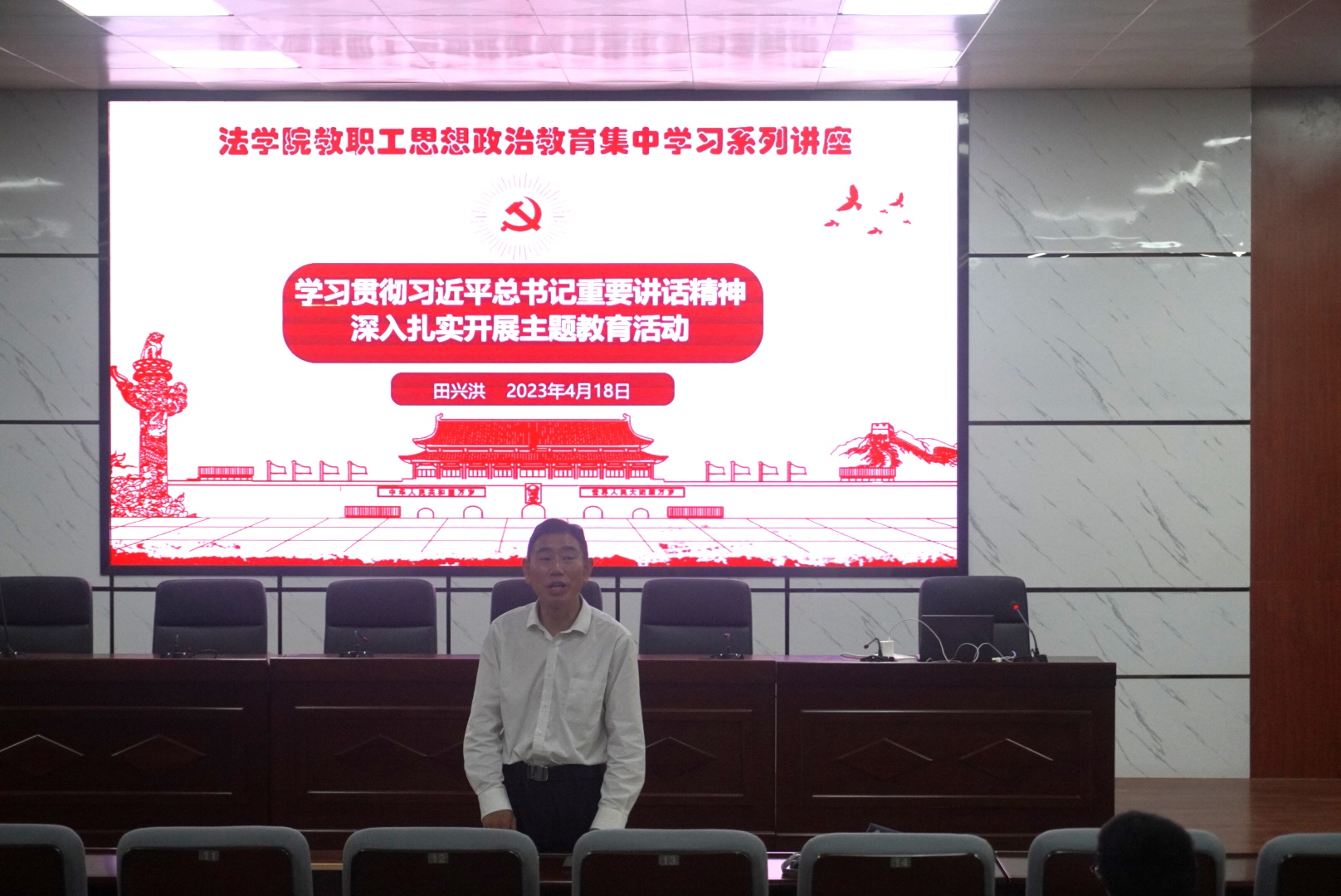 4月18日下午,法学院在金盆岭校区四号教学楼一楼学术报告厅召开全体教职工大会,开展思想政治教育集中学习,传达学校主题教育动员大会精神会议,院党总支书记田兴洪主持会议。