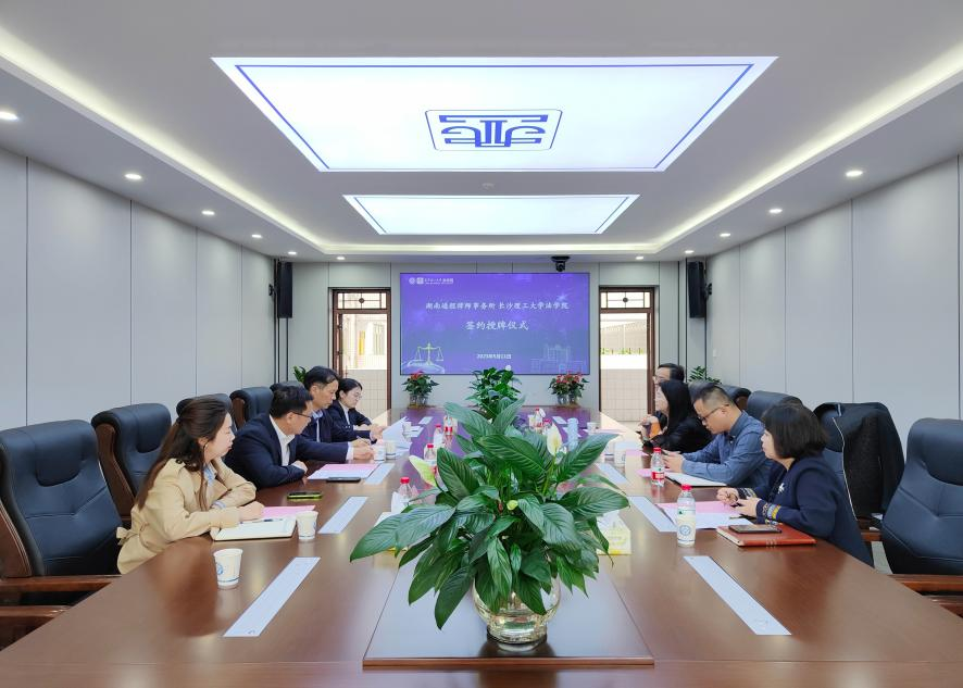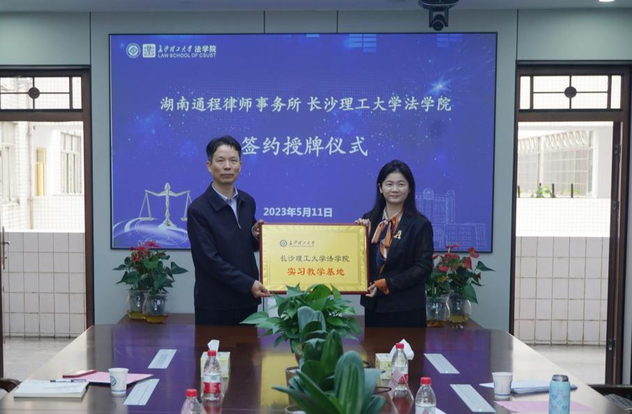 在签约环节,张敏纯院长与谢广军主任分别代表双方在合作协议上签字,张敏纯院长代表法学院向湖南通程律师事务所现场授牌,并举行授牌仪式。