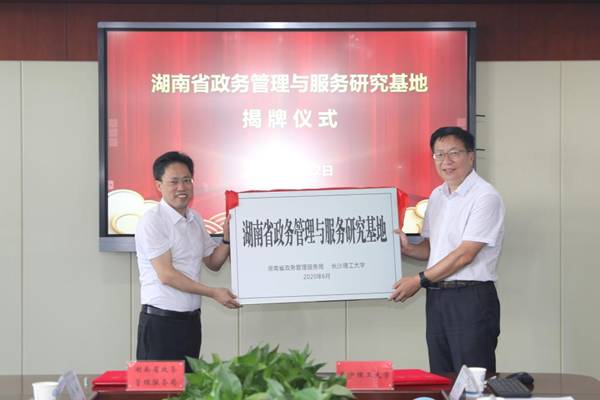 仪式上,杨伟军代表学校与湖南省政务管理服务局签署了战略合作框架协议。付宏渊和向世聪共同为“湖南省政务管理与服务研究基地”揭牌。