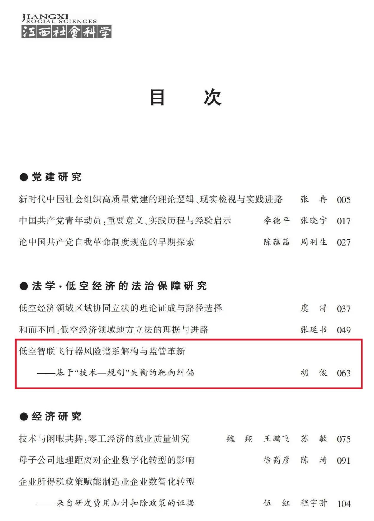近日,XK星空法学院讲师胡俊在《江西社会科学》2025年第5期发表论文《低空智联飞行器风险谱系解构与监管革新—基于“技术—规制”失衡的靶向纠偏》。