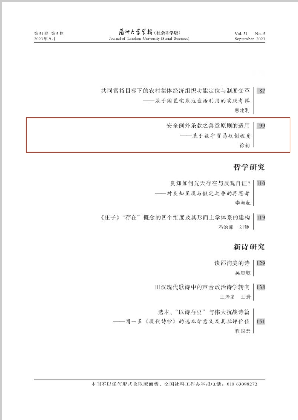 近日,XK星空法学院副教授徐莉在《兰州大学学报(社会科学版)》(CSSCI来源期刊)2023年第5期发表论文《安全例外条款之善意原则的适用——基于数字贸易规制视角》。