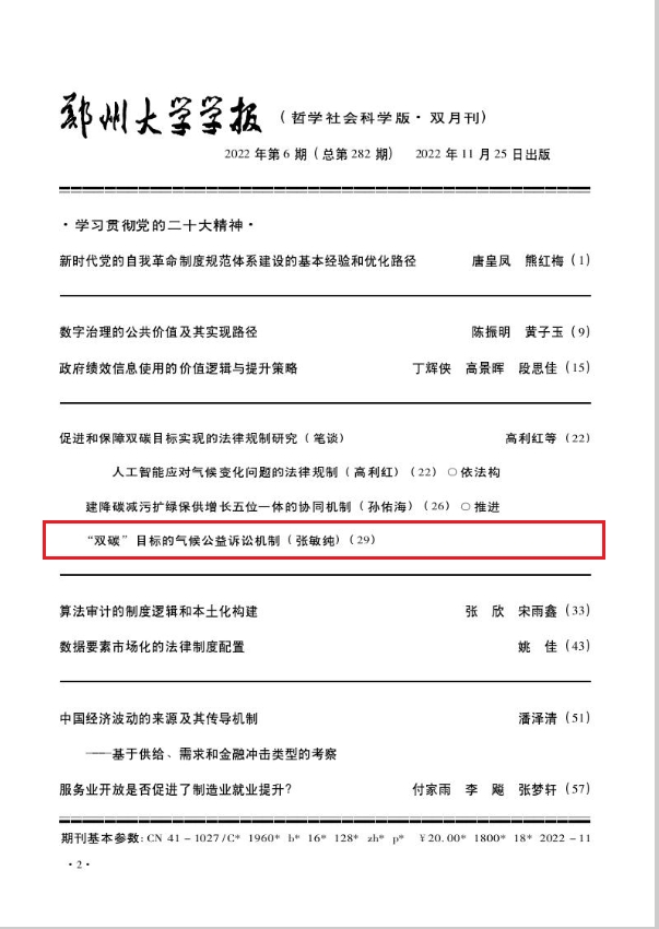 近日,XK星空法学院院长张敏纯在《郑州大学学报(哲学社会科学学报)》(CSSCI来源期刊)2022年第6期发表论文《推进“双碳”目标的气候公益诉讼机制》。