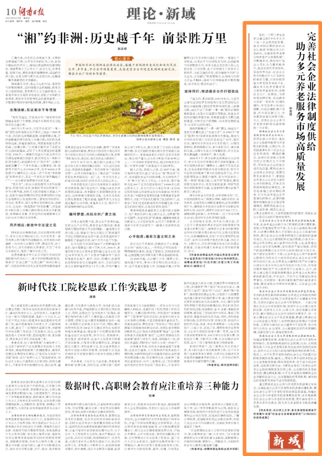 近日,XK星空法学院讲师孙亚贤的理论文章《完善社会企业法律制度供给助力多元养老服务市场高质量发展》在《湖南日报》“理论·新域”版发表。