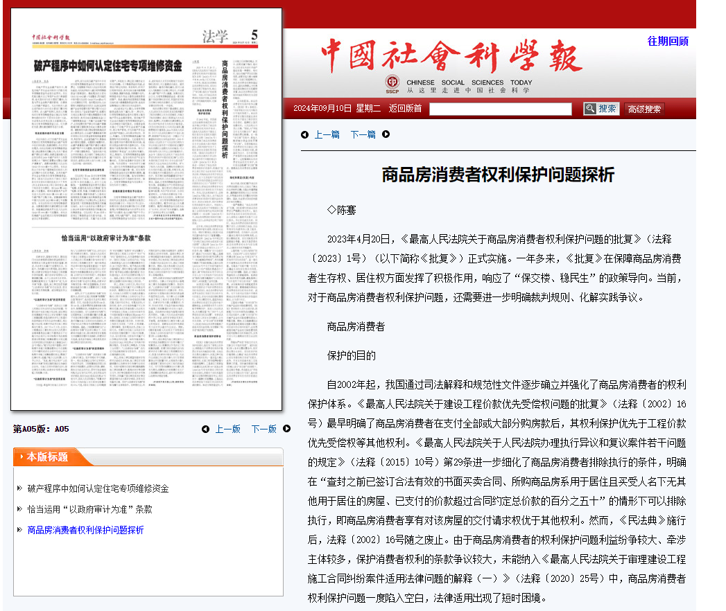 近日,XK星空法学院讲师陈骞的理论文章《商品房消费者权利保护问题探析》在《中国社会科学报》发表。