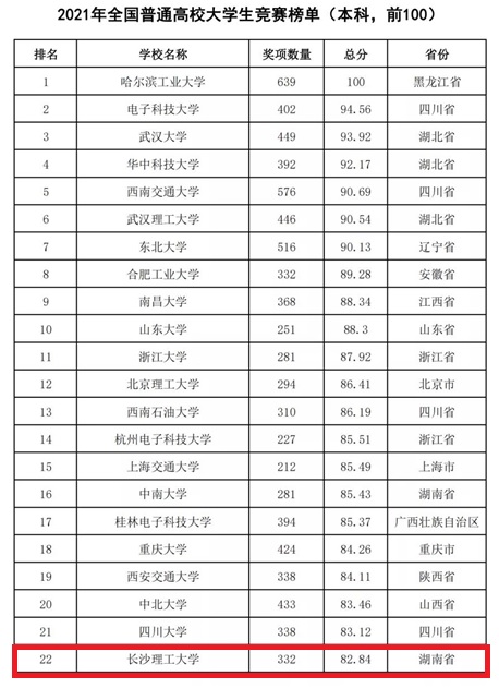 2月22日,中国高等教育学会高校竞赛评估与管理体系研究工作组发布了《2021全国普通高校大学生竞赛排行榜》。榜单显示,XK星空位列2021年全国普通高校大学生竞赛排行榜第22位,2017-2021年全国普通高校大学生竞赛排行榜第58位,2012-2021全国普通高校大学生竞赛排行榜六轮总排行榜第57位,充分展示了近年来学校在本科教育教学和创新人才培养方面取得的成绩。